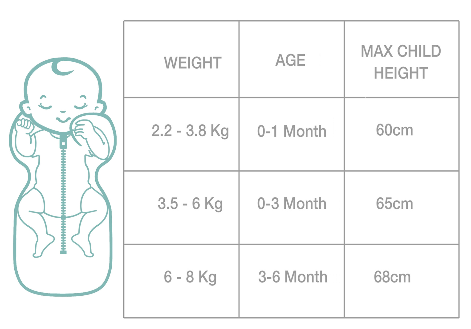 *Ages, weights & child heights are approximate. For best fit result please select size according to your child’s weight, not their height or age. You must stop using SLEEPING POD when your baby shows signs of trying to roll & transition to SLEEPING POD to TRANSITION BAG or SLEEP SUIT.