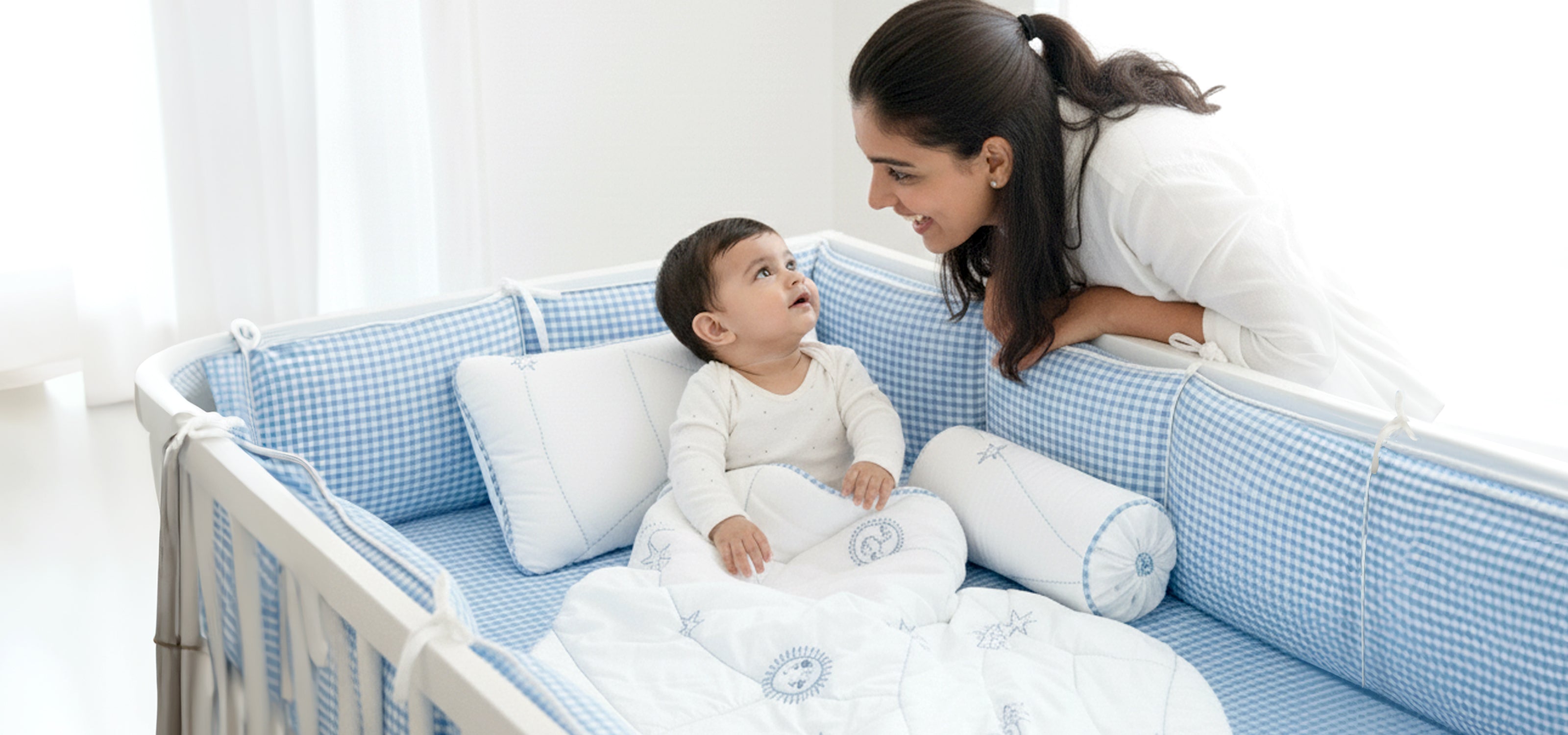 Our sets come in four standard crib sizes — Mini Cot (85 × 50 cm), Standard Cot (120 × 60 cm), and Bed Cot (140 × 72 cm).