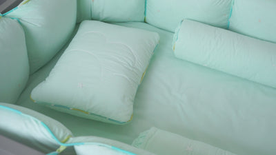 Tulo Baby Bedding Set, premium cotton baby bedding which includes pillow and bolster set and fitted sheet. Add a quilt/dohar and a bumper to make a complete bedding set. Soft,breathable and safe for newborns. Perfect for cozy sleep in cots and cribs.Soft,breathable, and safe for newborns.