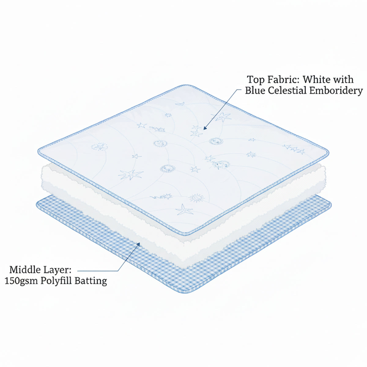 Wrap your baby in handcrafted comfort with our Celestial Blue Dream Quilt & Dohar.Soft cotton, hand-embroidered celestial motifs, and reversible gingham design.